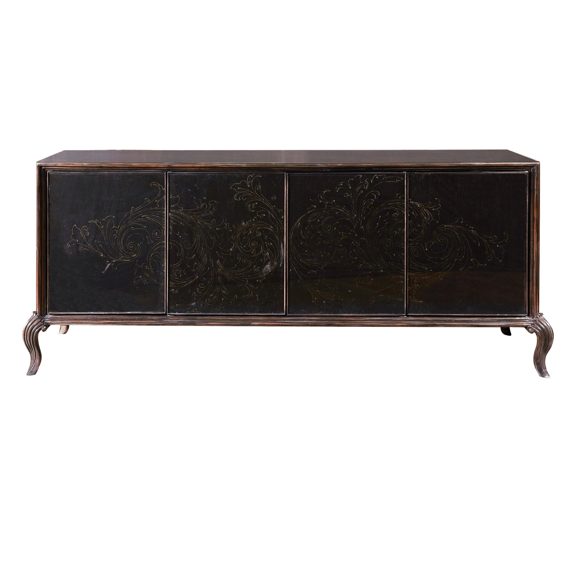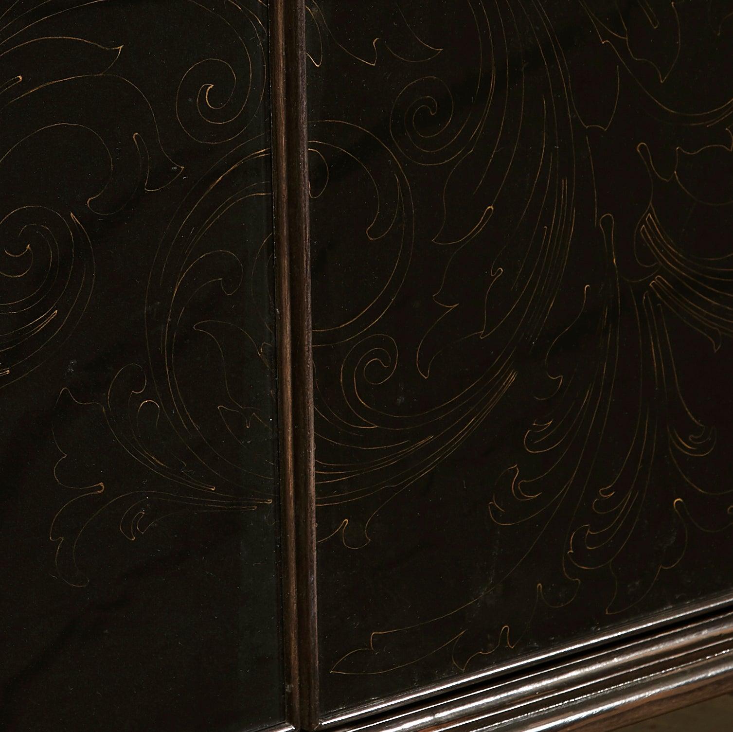 Exquisitely designed, this 4 Door Media Credenza exhibits bold beauty and classic motifs with a modern aesthetic. An ornate vectorized scroll design with hints of gold is displayed across the four glass doors, adding a baroque, oriental flair to a modern silhouette. Two tray drawers behind the center doors and one adjustable/removable shelf behind each door offer versatile storage options, while power supply and cord access keep all media devices operating. The high-sheen black finish characterized by gold rub-through highlights and cabriole-style feet provides the finishing touch that completes the look of this piece.
