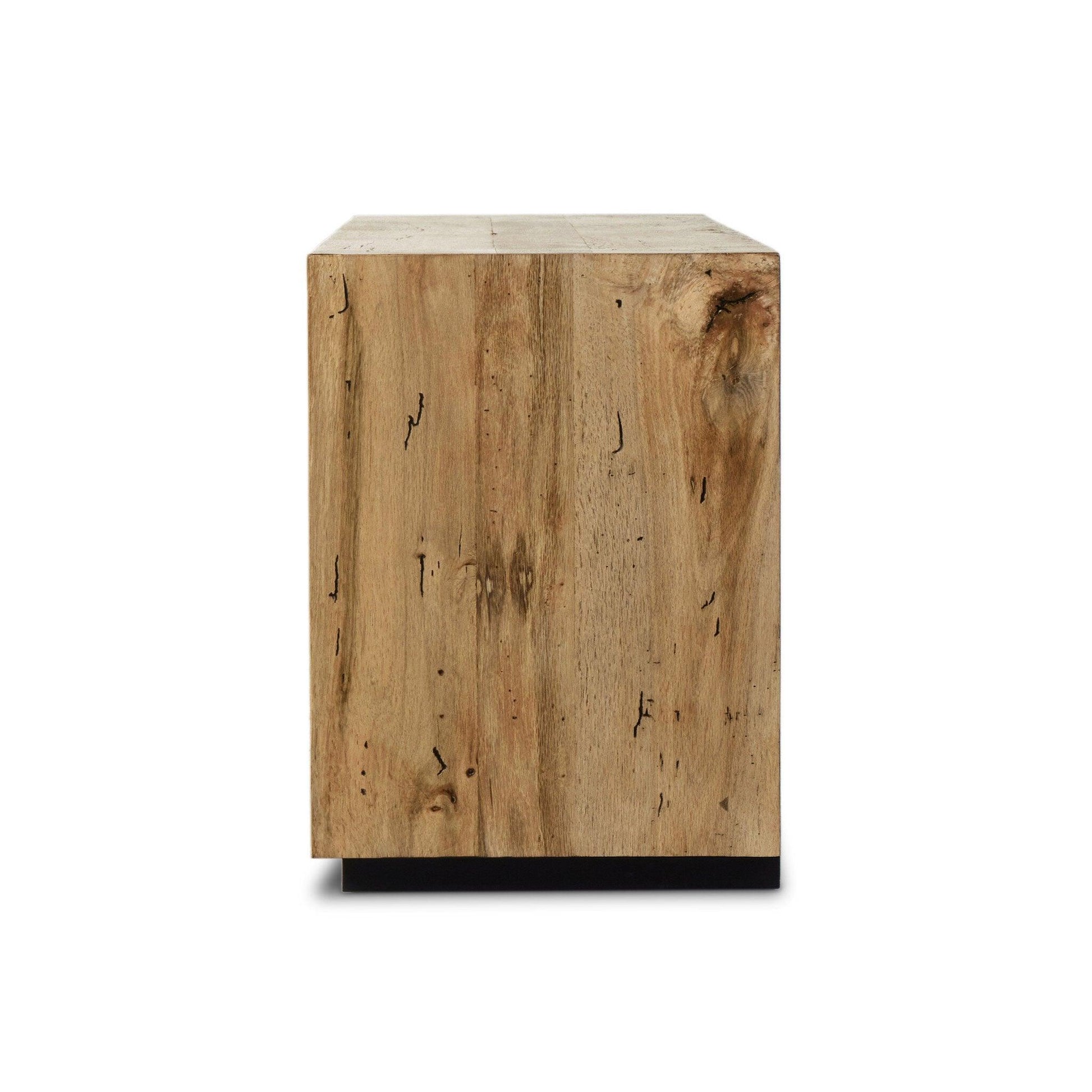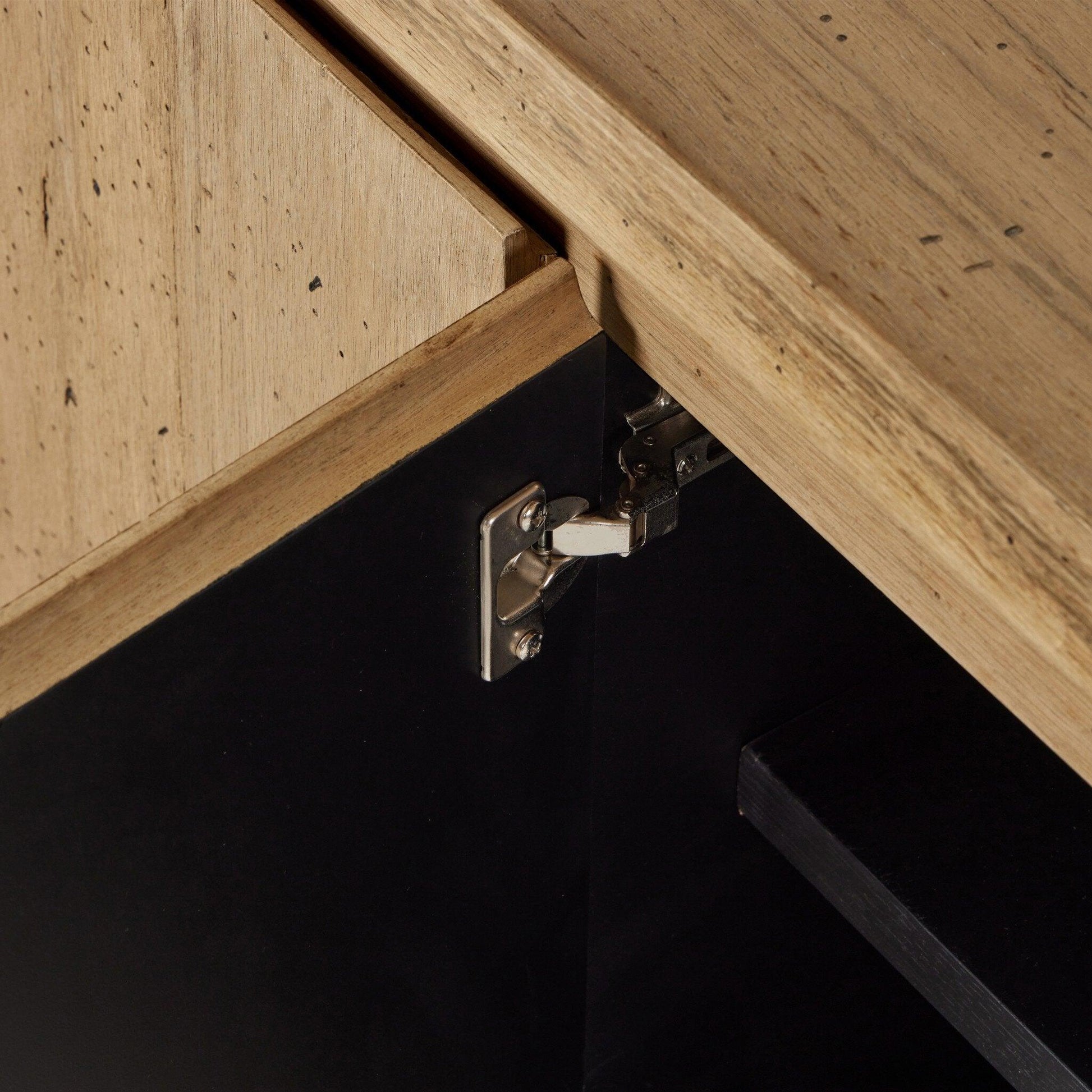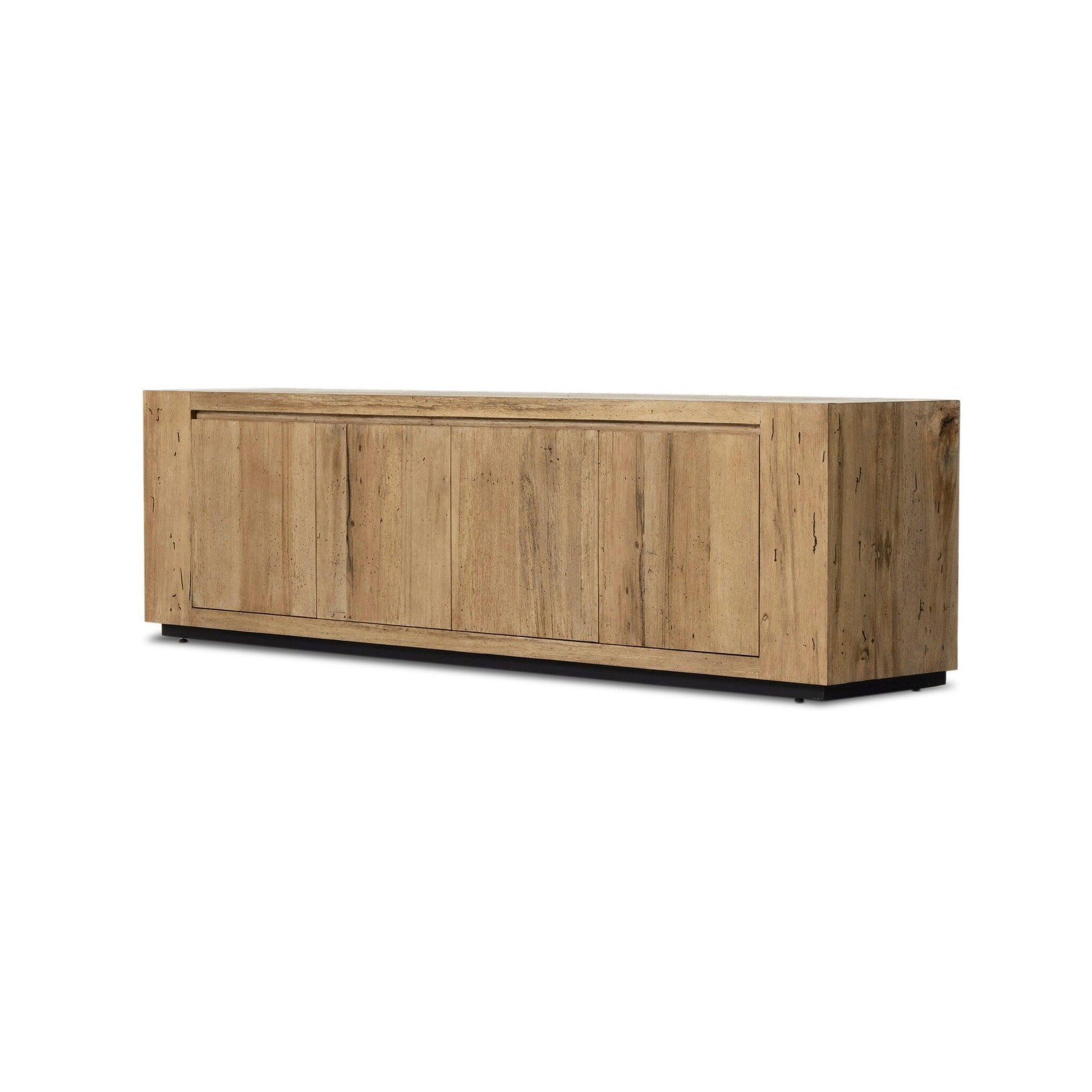 Made from thick-cut oak veneer with a faux rustic finish made to emulate wormwood this spacious media console features chunky squared legs and dovetail joinery detailing.