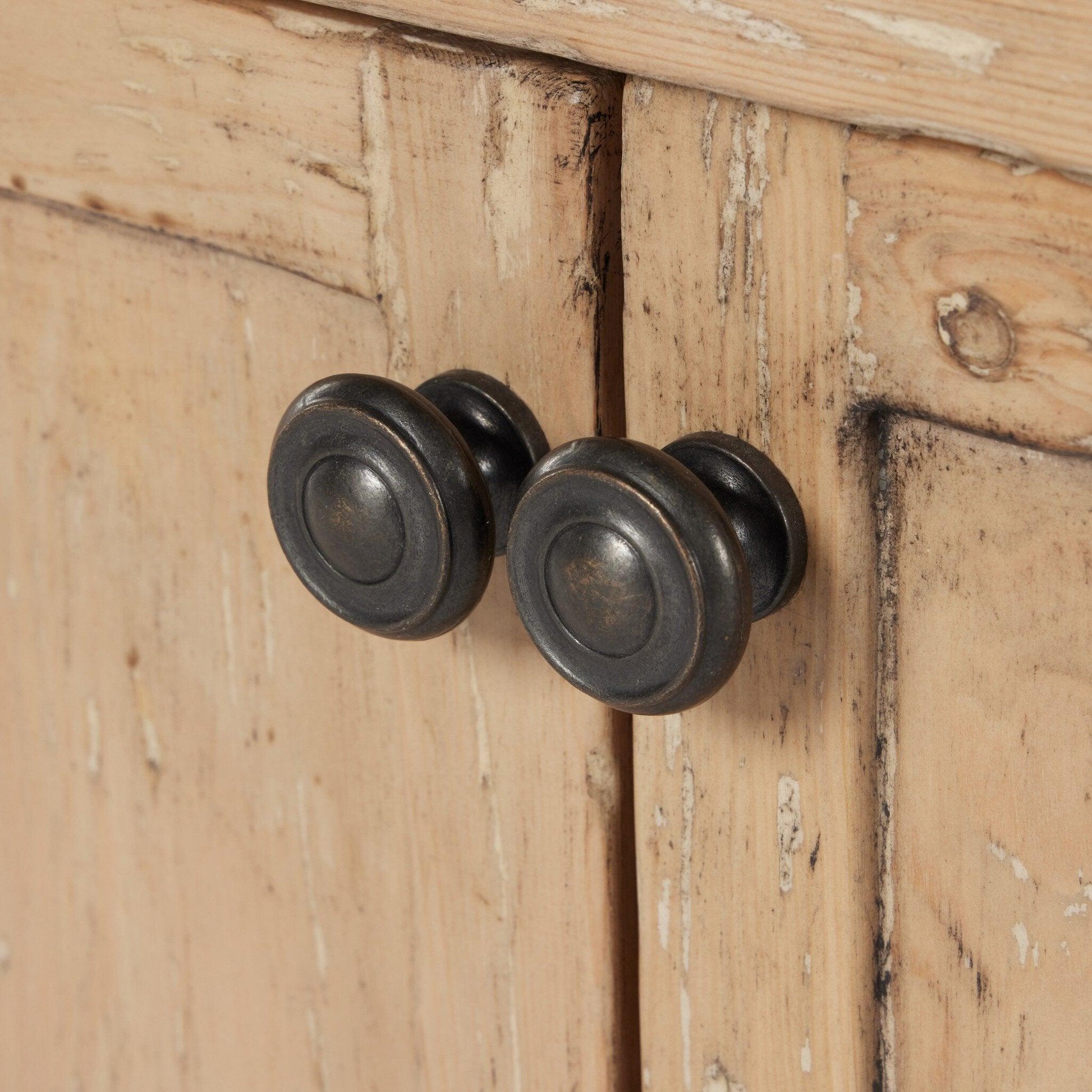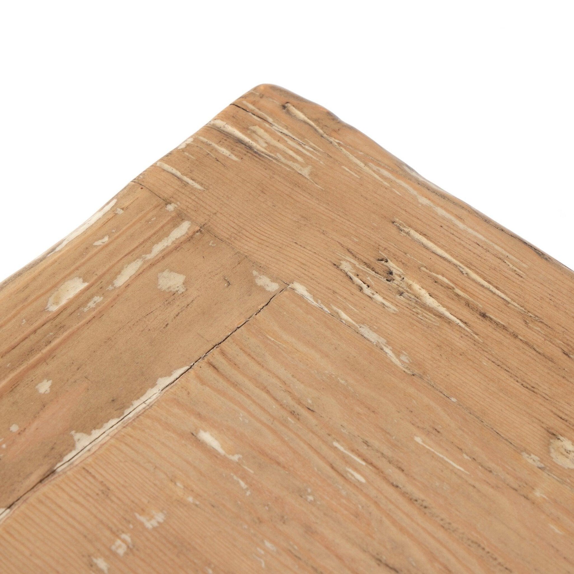 A simply shaped media console that's grand in scale. Light waxed pine finished with a distressed look and accented with distressed copper hardware.