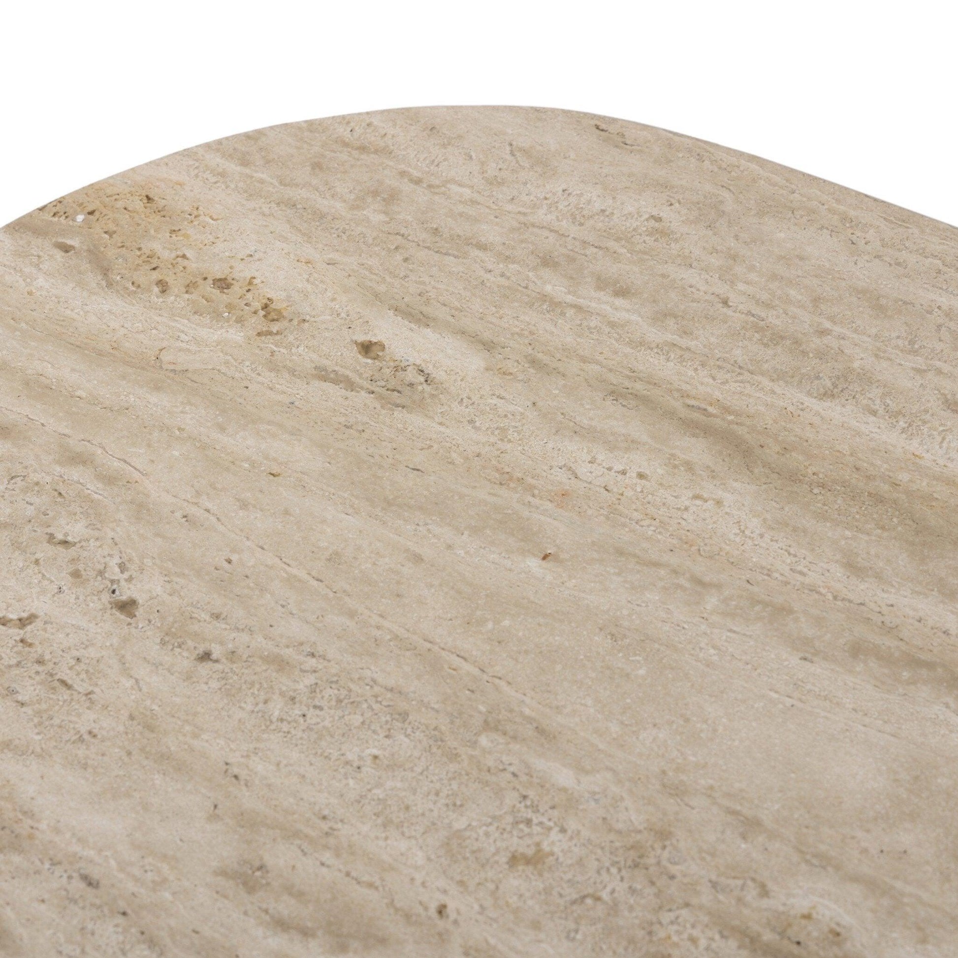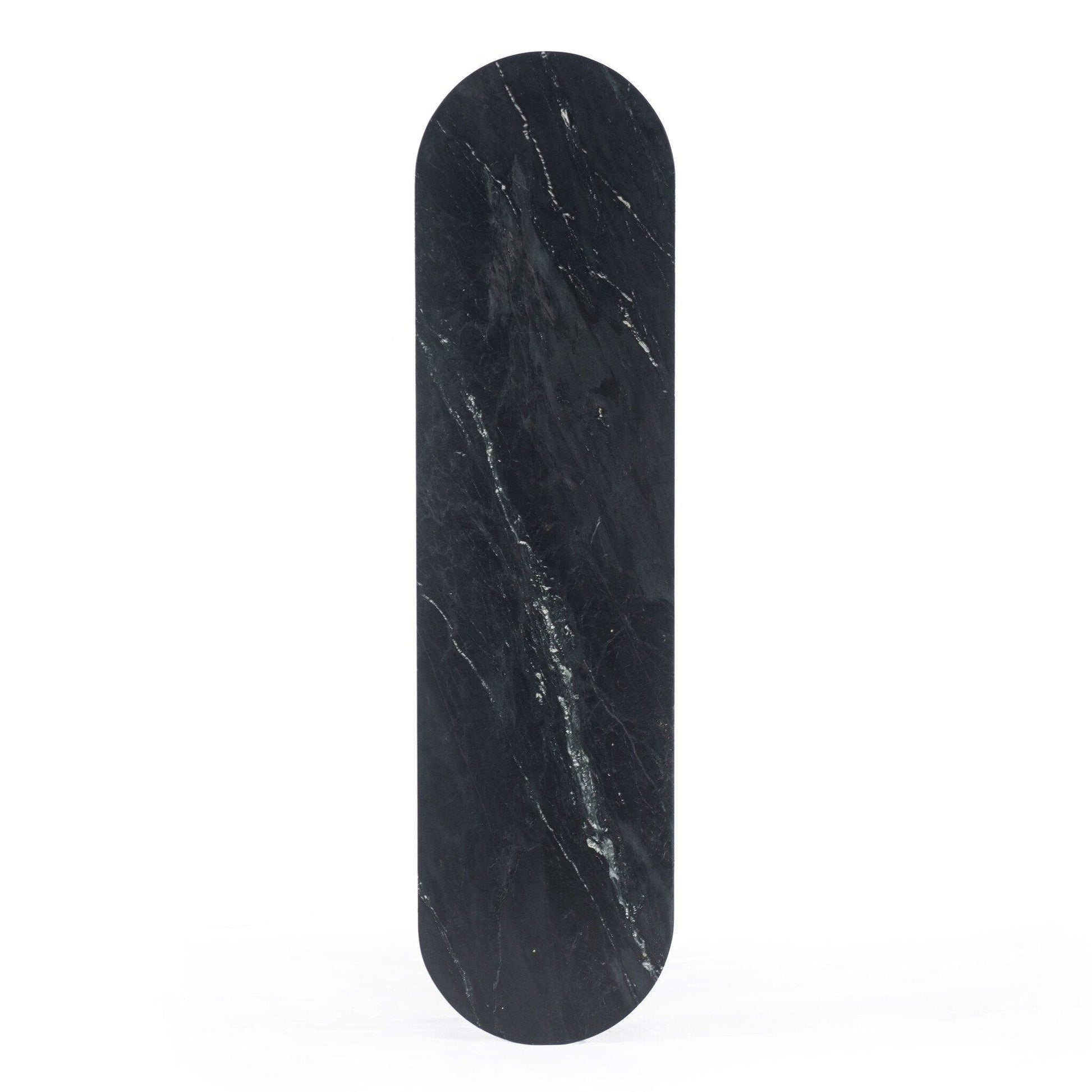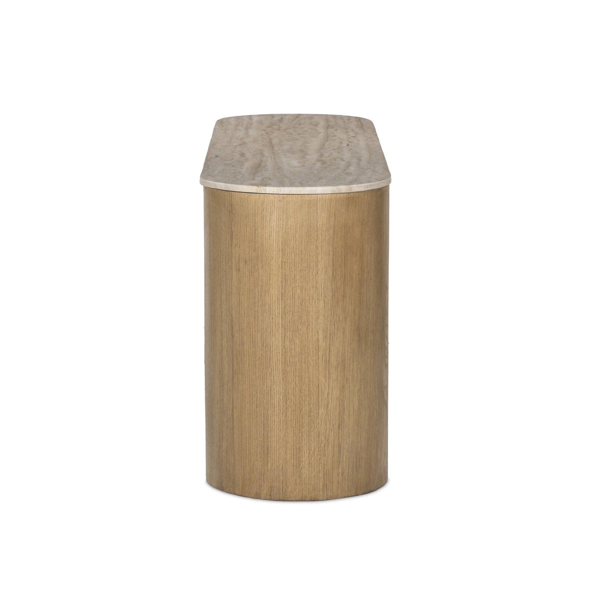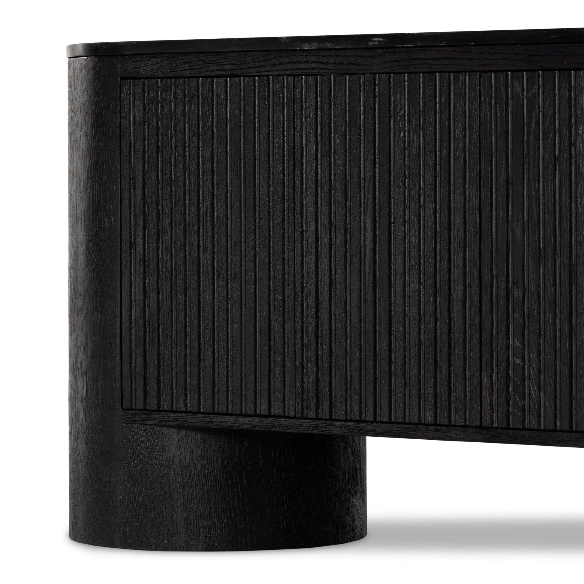 Classic materials modern styling. A rounded overscale base supports oak veneer casing finished in a classic black with fluted ribbing for texture on doors. A black marble top features white veining bringing a hint of movement to this unique piece.