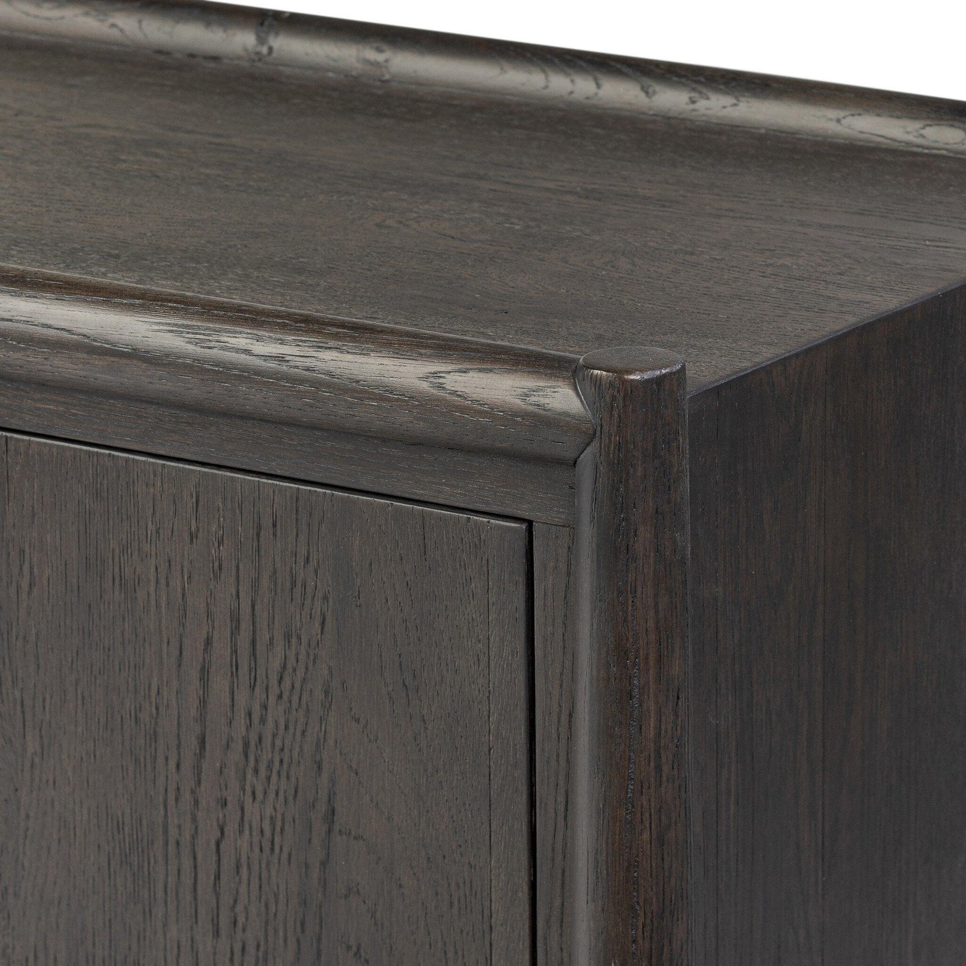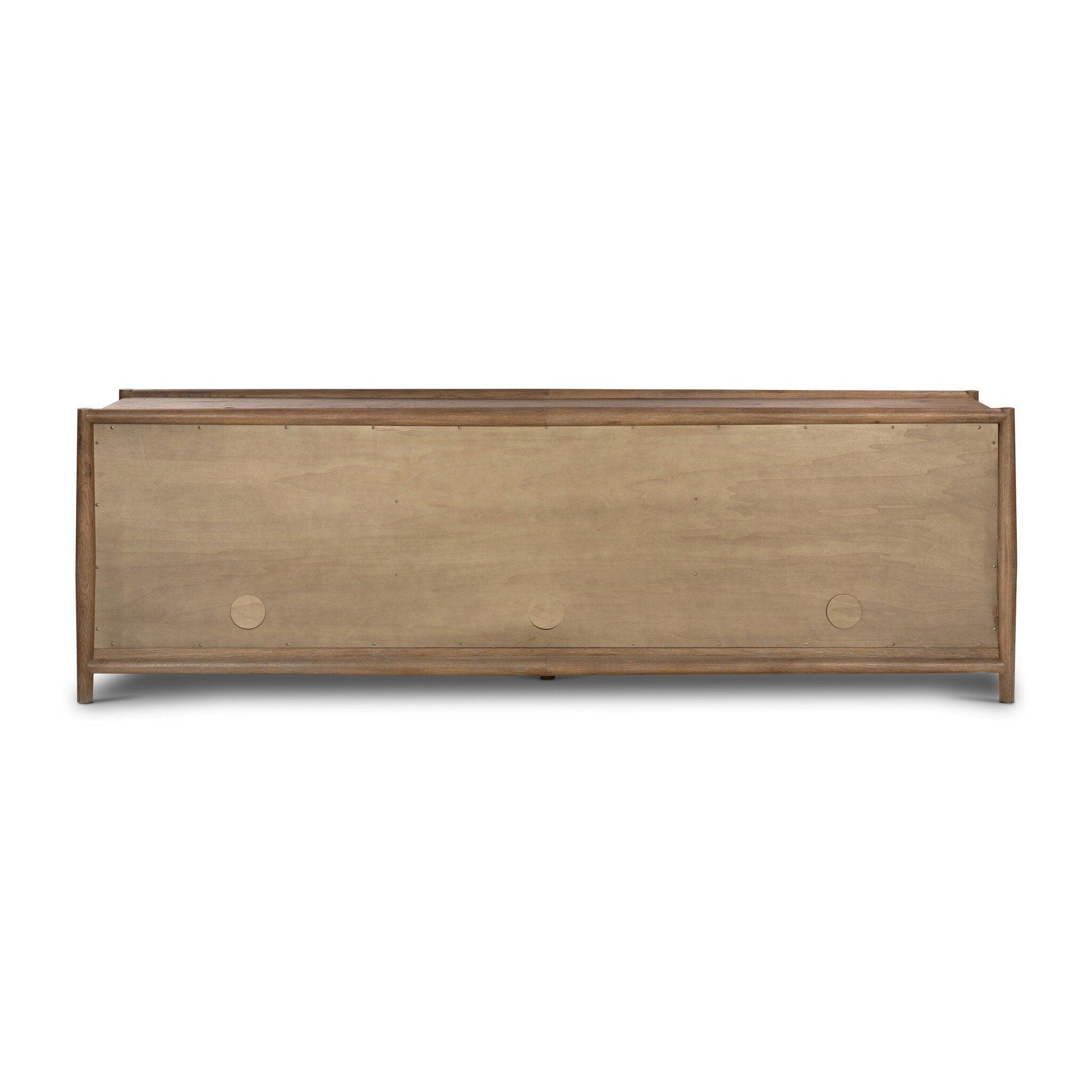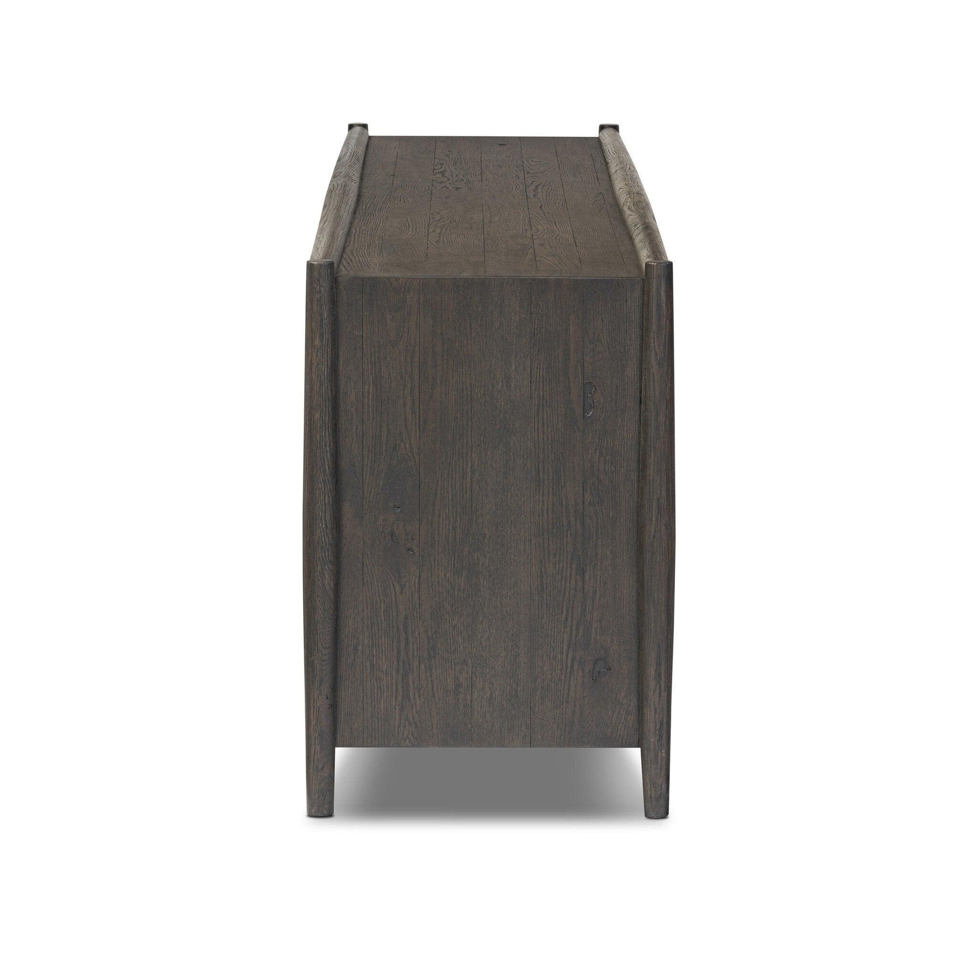 Traditional reimagined. Made from rustic weathered oak a six-door sideboard brings generous storage space to the dining room and beyond. Simple cylindrical hardware is finished in an aged bronze.