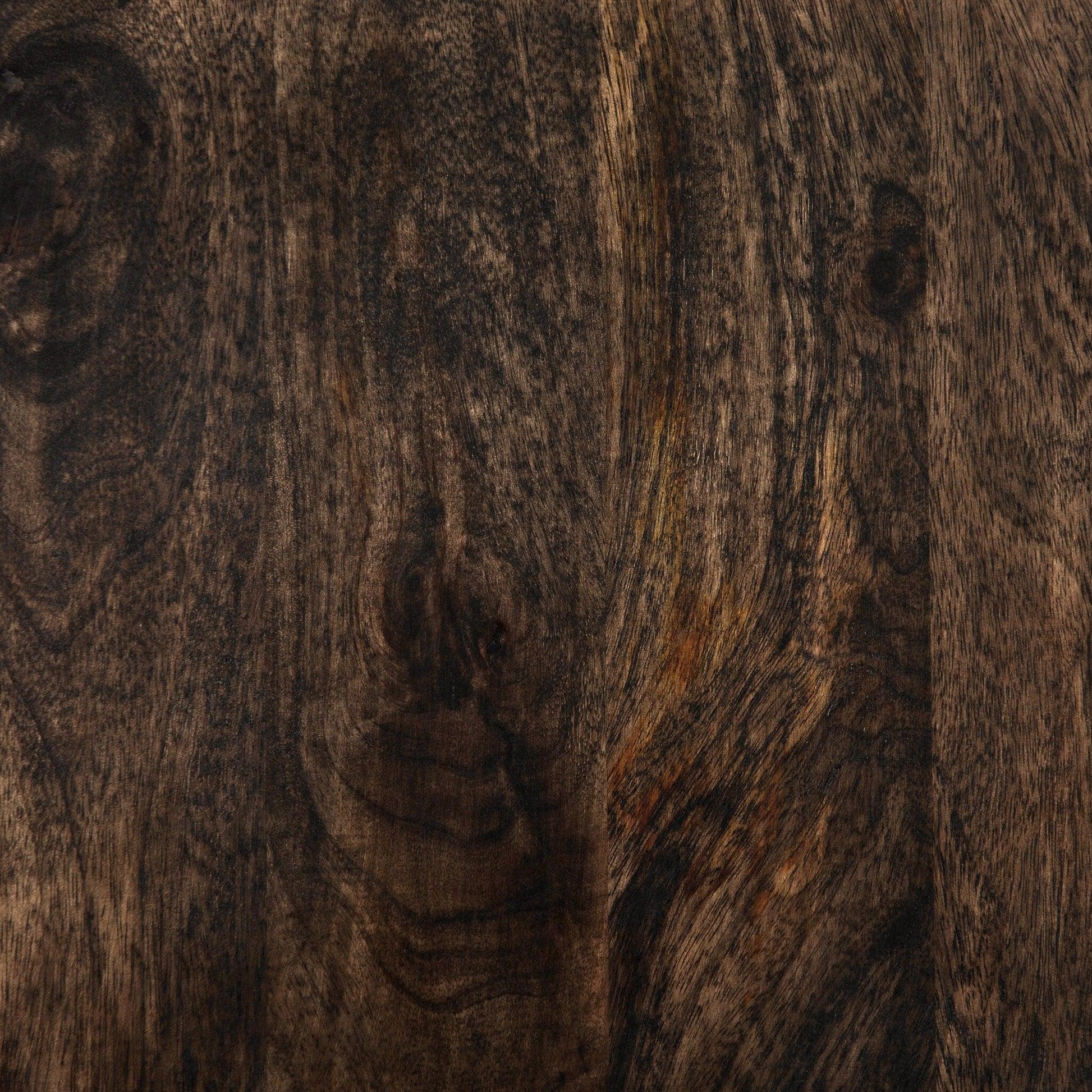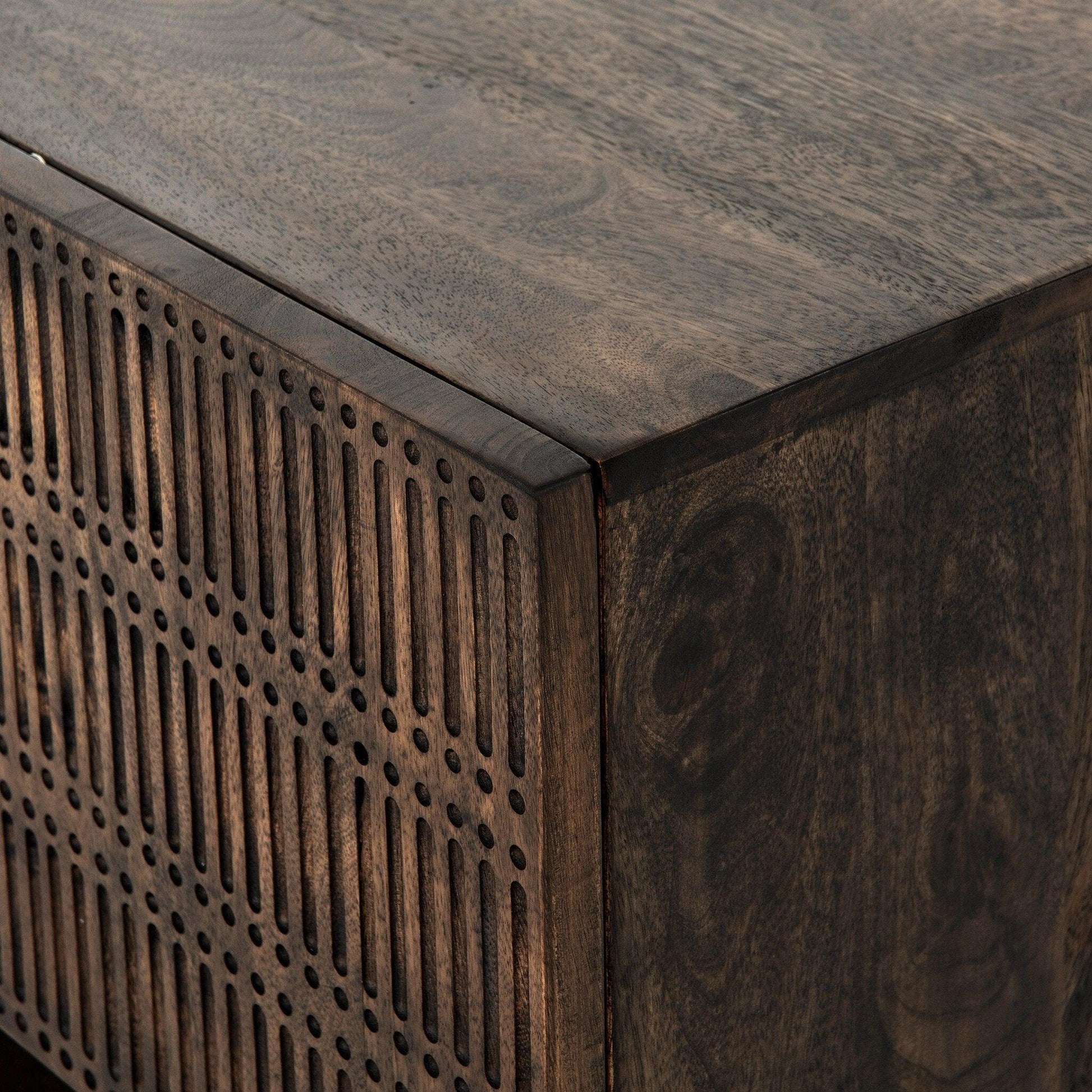 Unique linear carving meets new dimension with an artisan slant. Mango wood casing is finished in a vintage brown highlighting texture and craftsmanship. A slim iron base adds an airy cage-like look to small-scale media storage. Rear cutouts for cord management.