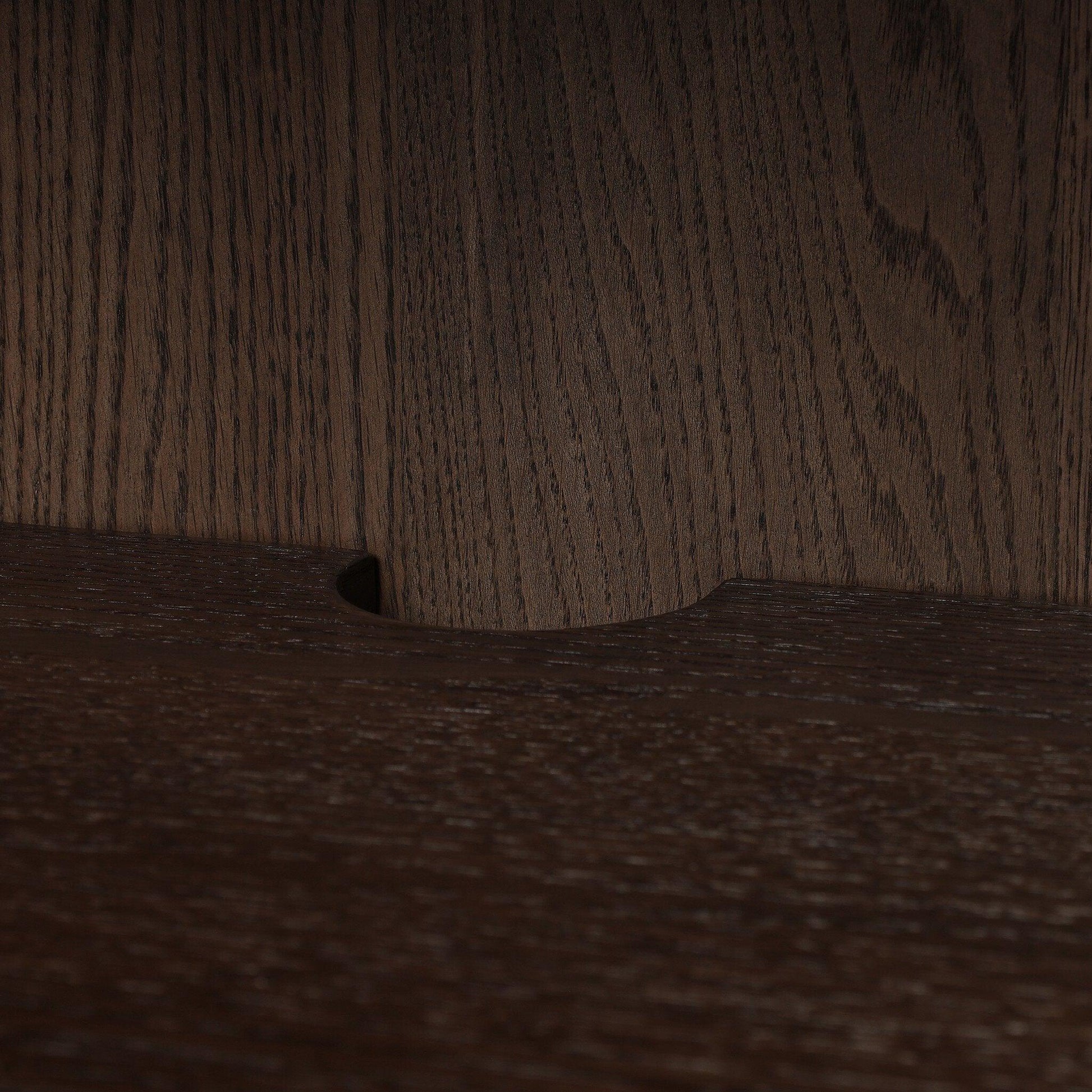 For a more traditional take on industrial design an oak frame pairs with a metal base and simple hardware. Interior shelving and drawers bring generous storage space to the media room and beyond while glass doors add lightness.