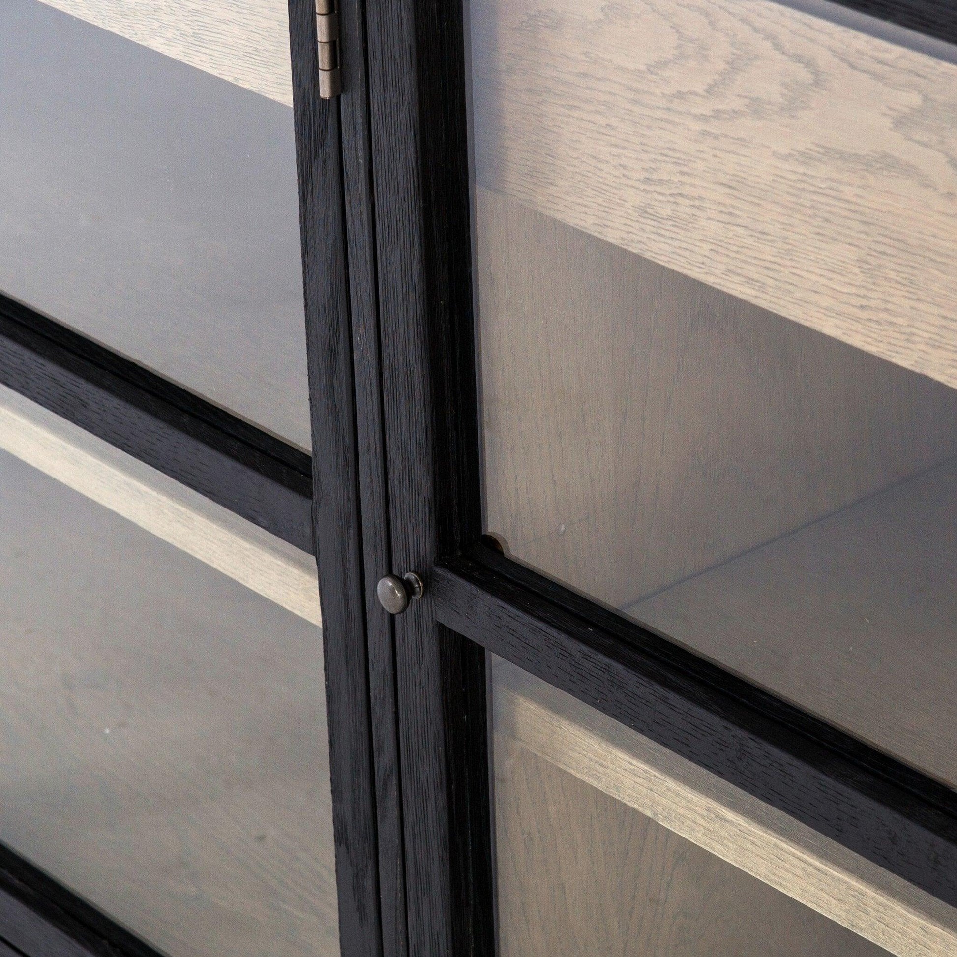 Black drifted oak frames lighter interior shelving for subtle but striking contrast. Glass doors allow for prized possessions to dazzle on display while spacious interior drawers add out-of-view storage options.