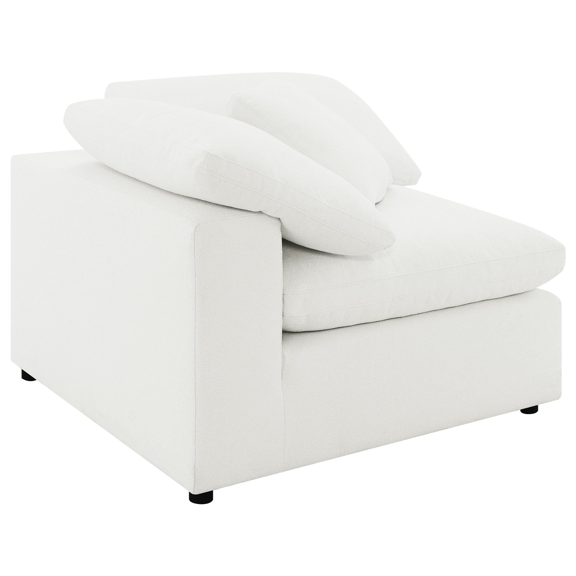 Design a custom configuration for your modular sectional with a modern corner chair. This foundational piece features neutral water-resistant boucle upholstery for an on-trend look and feel that works in a variety of homes and living spaces. The corner chair connects with armless chairs, creating an L-shaped bend or ending a straight section, creating a custom sectional setup in your living room. Foam cushions pair with feather blend for exceptional comfort and a plush feel you'll love when lounging. A loose pillow back with two full-sized pillows and an accent pillow completes the look.