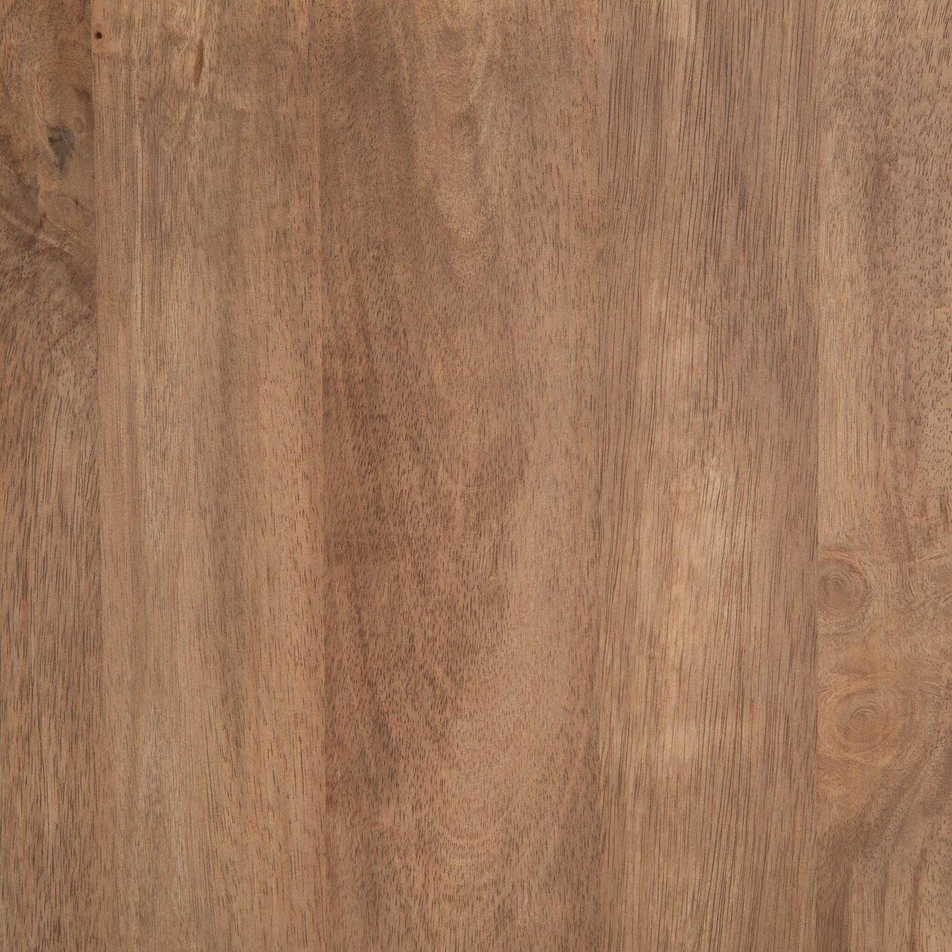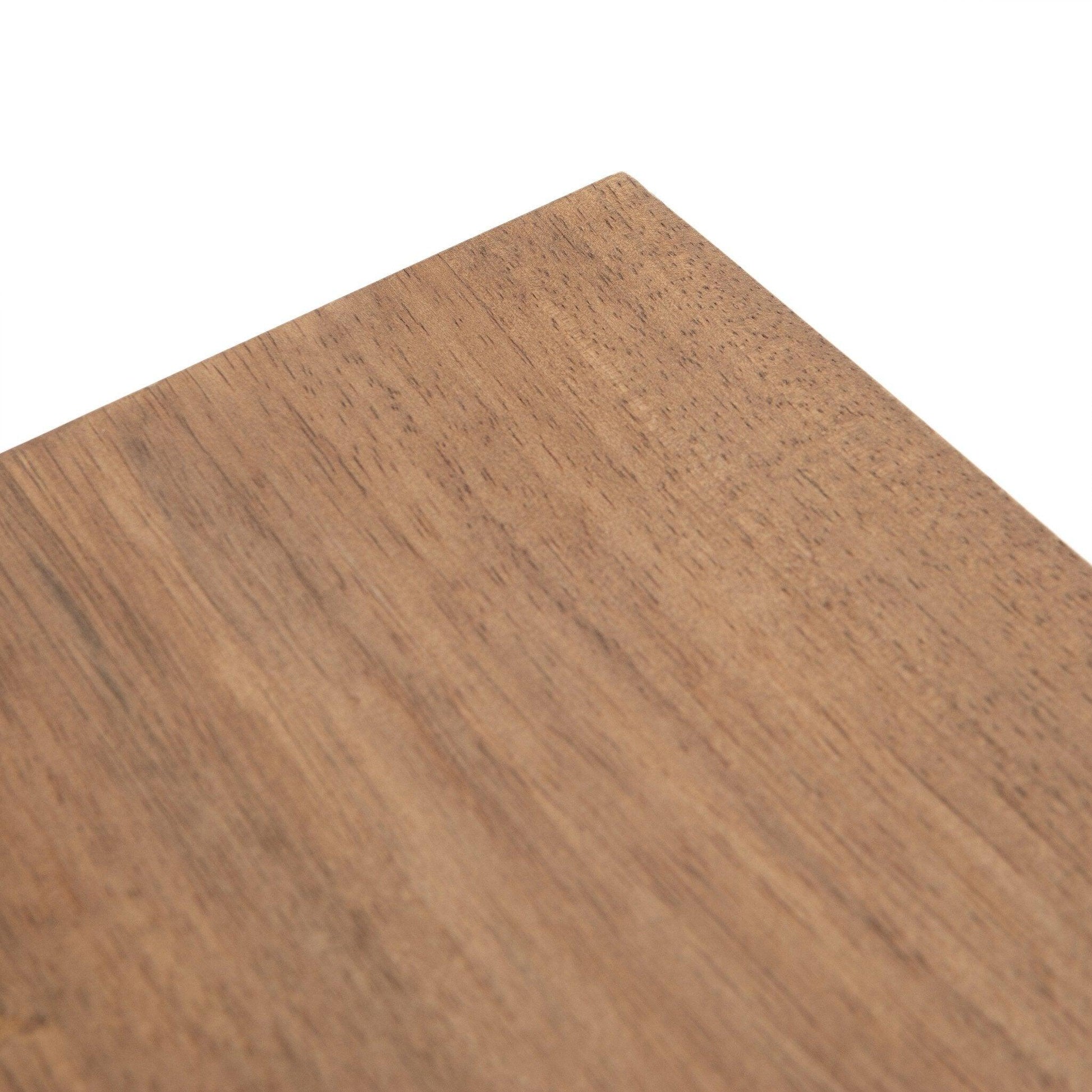 Mid-century styling with a Shaker spirit. Finished in a light smoked honey a clean-lined parawood console sits in an arched cradle base of toasted acacia for fresh contrast. Twist-lock metal hardware adds a clever finishing touch. Rear cutouts for cord management.