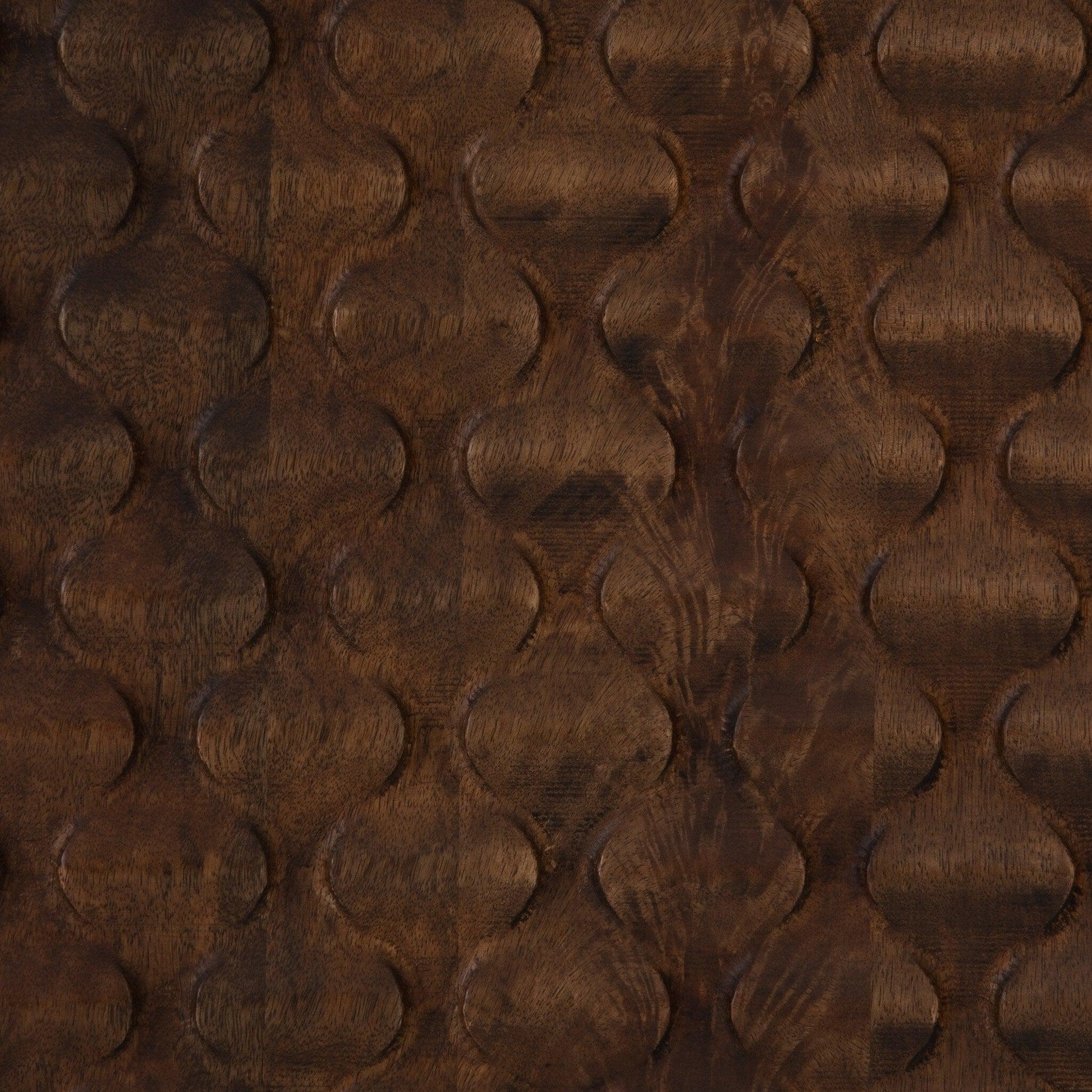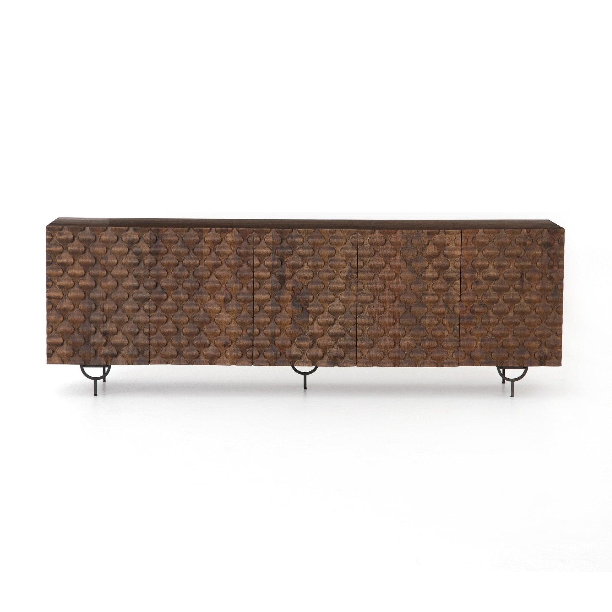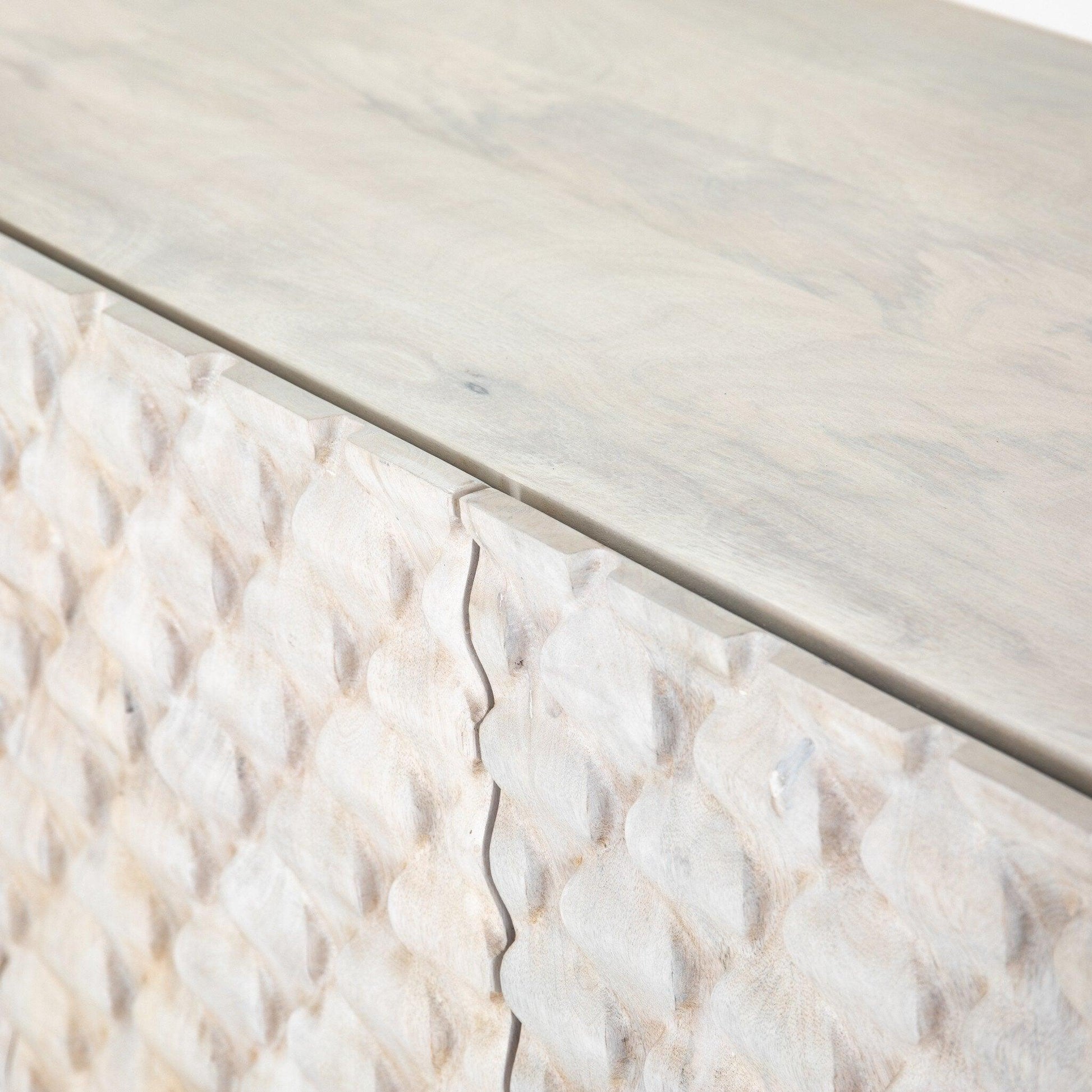 White-washed mango wood adopts intricate CNC carving for a uniquely textured look. Rounded iron legs offer an intriguing material mix with a modern touch. Spacious interior shelving for media plus rear cutouts for cord management.