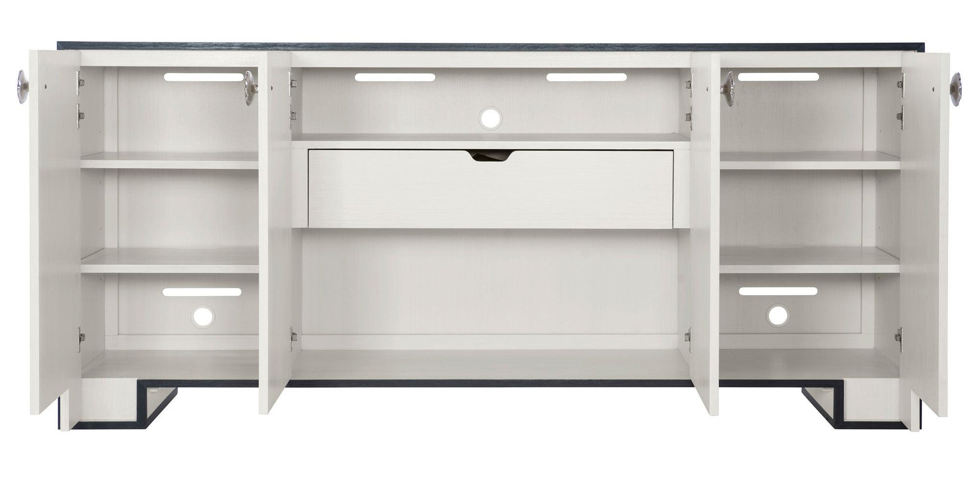 Buffet Two Tone Finish/ Eggshell On Case / Interior W/ Onyx Finish On Borders/ Four Soft / Self Closing Doors/ Behind Left And Right Doors Two Adjustable/ Removable Shelves/ Behind Center Doors Fixed Shelf/ Ventilation Holes And Grommet Hole W/ Cover/ Adjustable Glides/ Designed To Support Tv And / Or Other Media