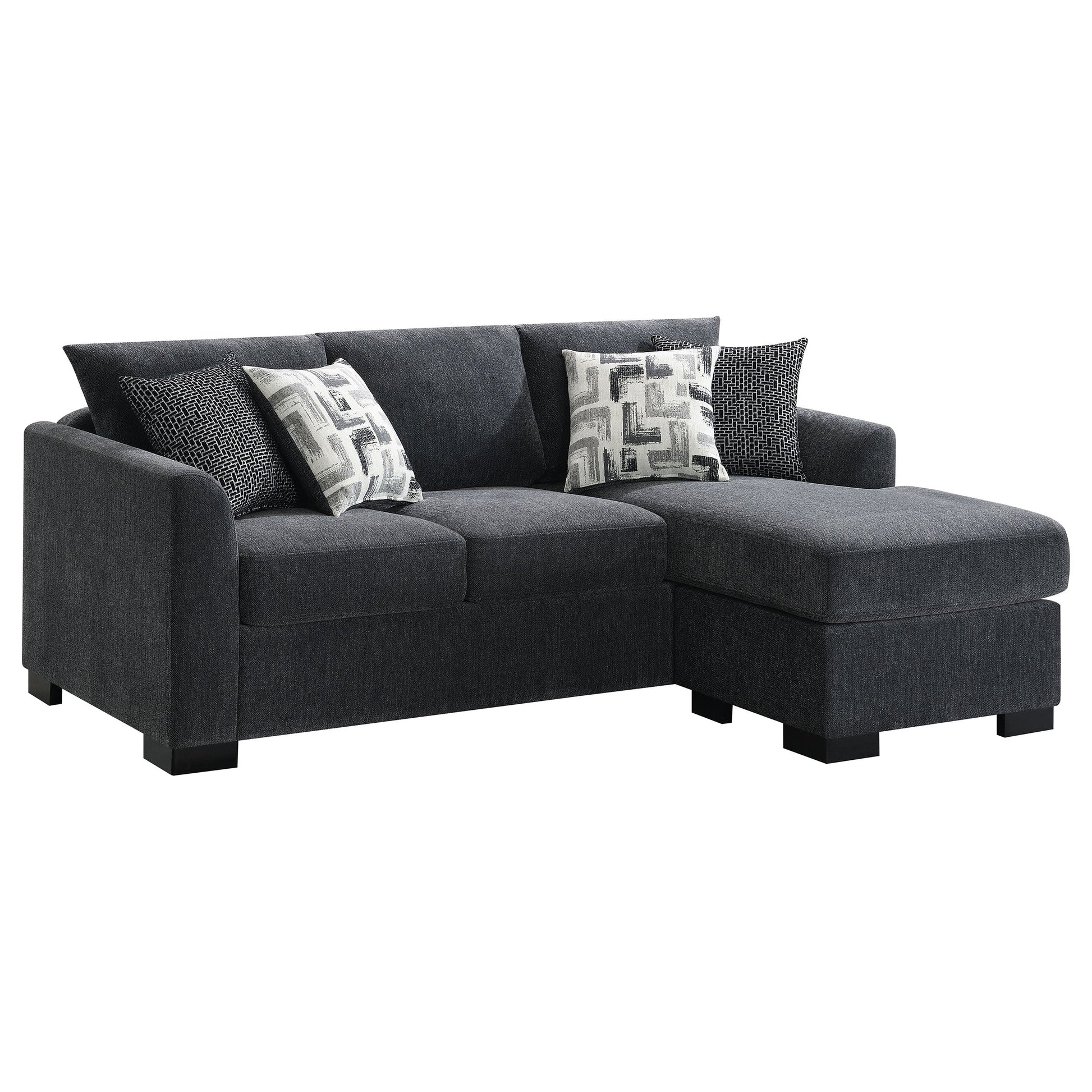 Refresh your living room or den with the contemporary style and easy versatility of a modern sleeper sectional sofa. Lending flexibility to your space, it boasts a chaise lounge for easy relaxation and expands to create a bed when overnight guests arrive. Its soft, inviting upholstery complements foam cushions and spring decking to create excellent support. Gently rounded track arms add a touch of character to a streamlined silhouette and block feet create stability. Four accent pillows add geometric prints to the ensemble, perfect for a contemporary living space.